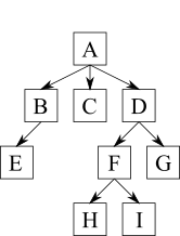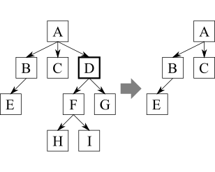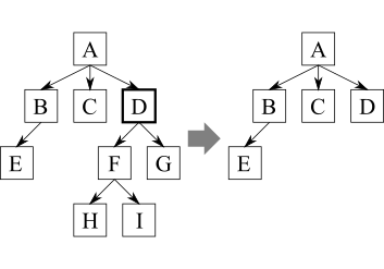 指定したノードと、そのノードを元とする枝全体を消去します。 例えば、下図の左側において「D」のノードを指定した場合、 D および F, G, H, I のノードも消去します。