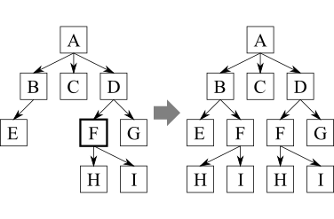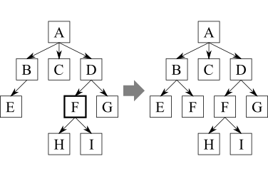 例えば、下図の左側で「F」のノードを「B」のノードの下に複製した場合、 新たな「F」ノードの子ノードとして「H」、「I」のノードも一緒に複製されます。